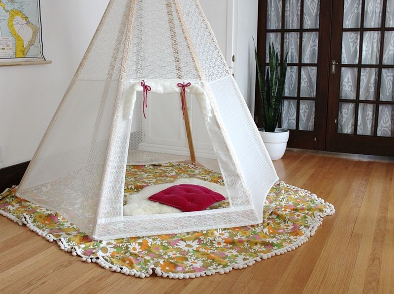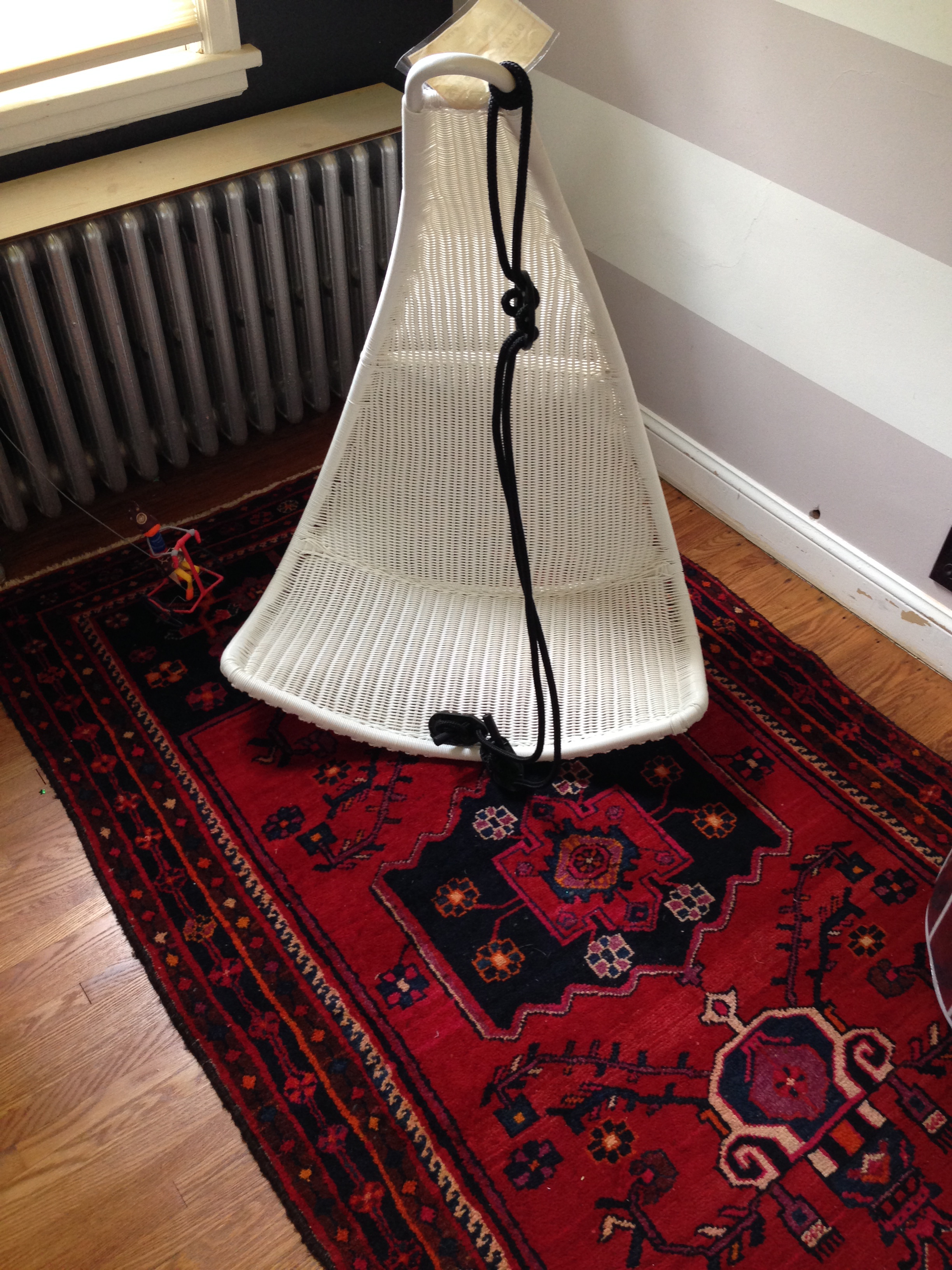 The basement has been cleared except for one corner of piled up junk, it is a basement after all;) All of the toys and furniture that are going to live there just need to be arranged. The main floor playroom is really taking off. It has been simplified and the base furniture and decoration is very neutral and calm. I think the space looks very inviting and the girls are totally into my plans to build a fort/tent/tepee hideout and to install a hanging chair (low and over a soft rug). I’ve added some work in progress pictures. Feast your eyes on some of my inspiration pictures for the tepee and hanging chair or better yet head over to my kids board on Pinterest.