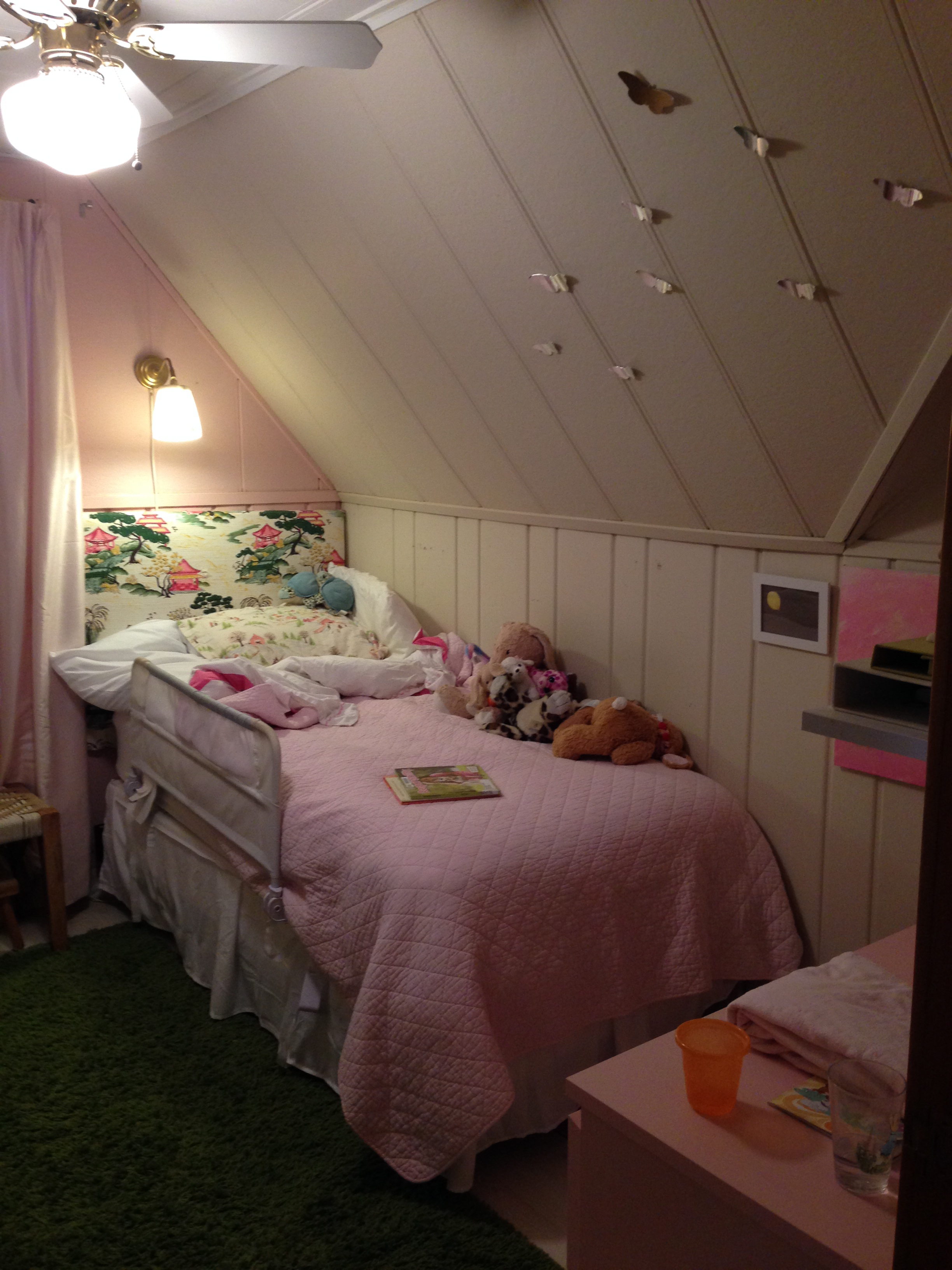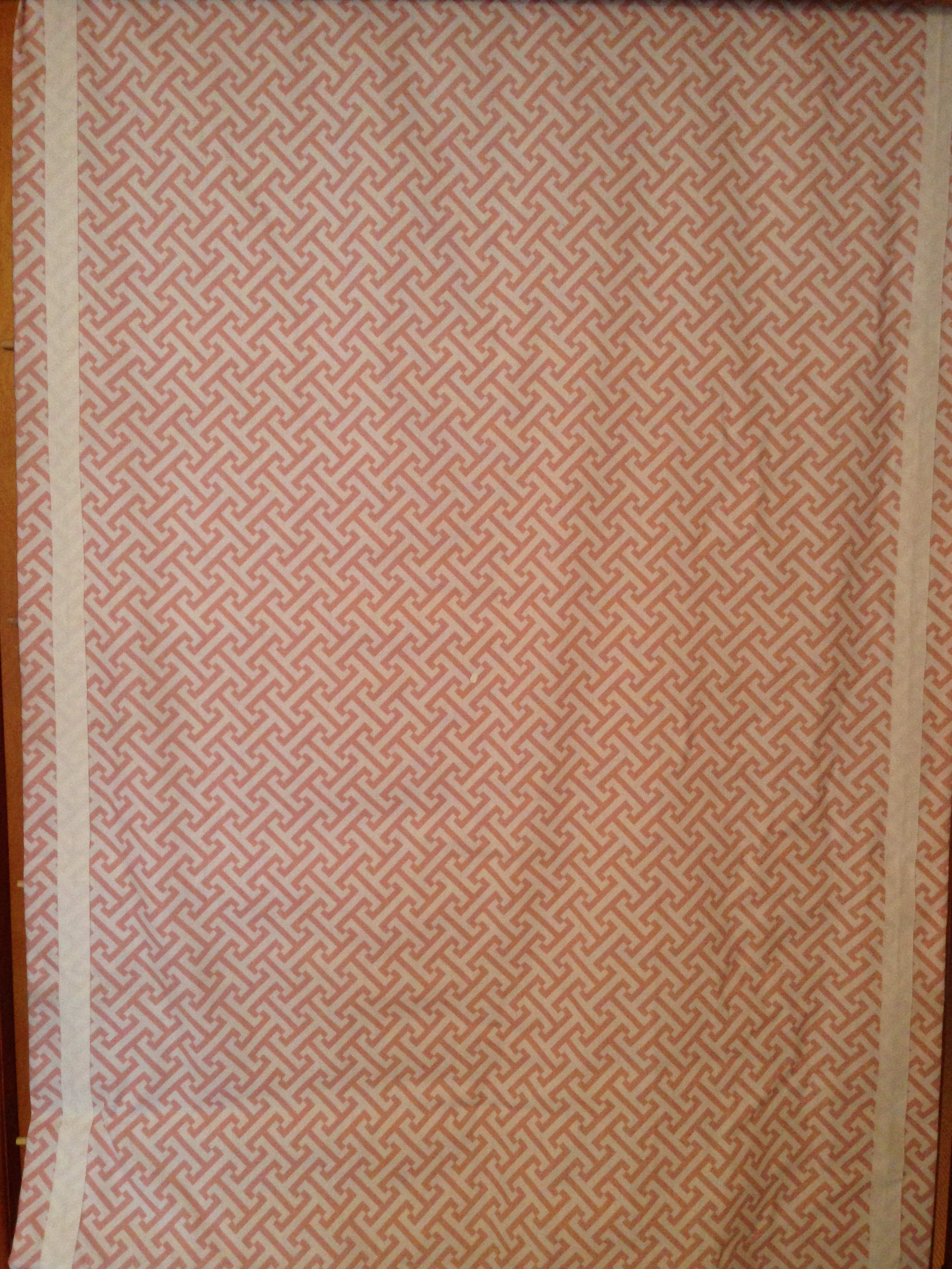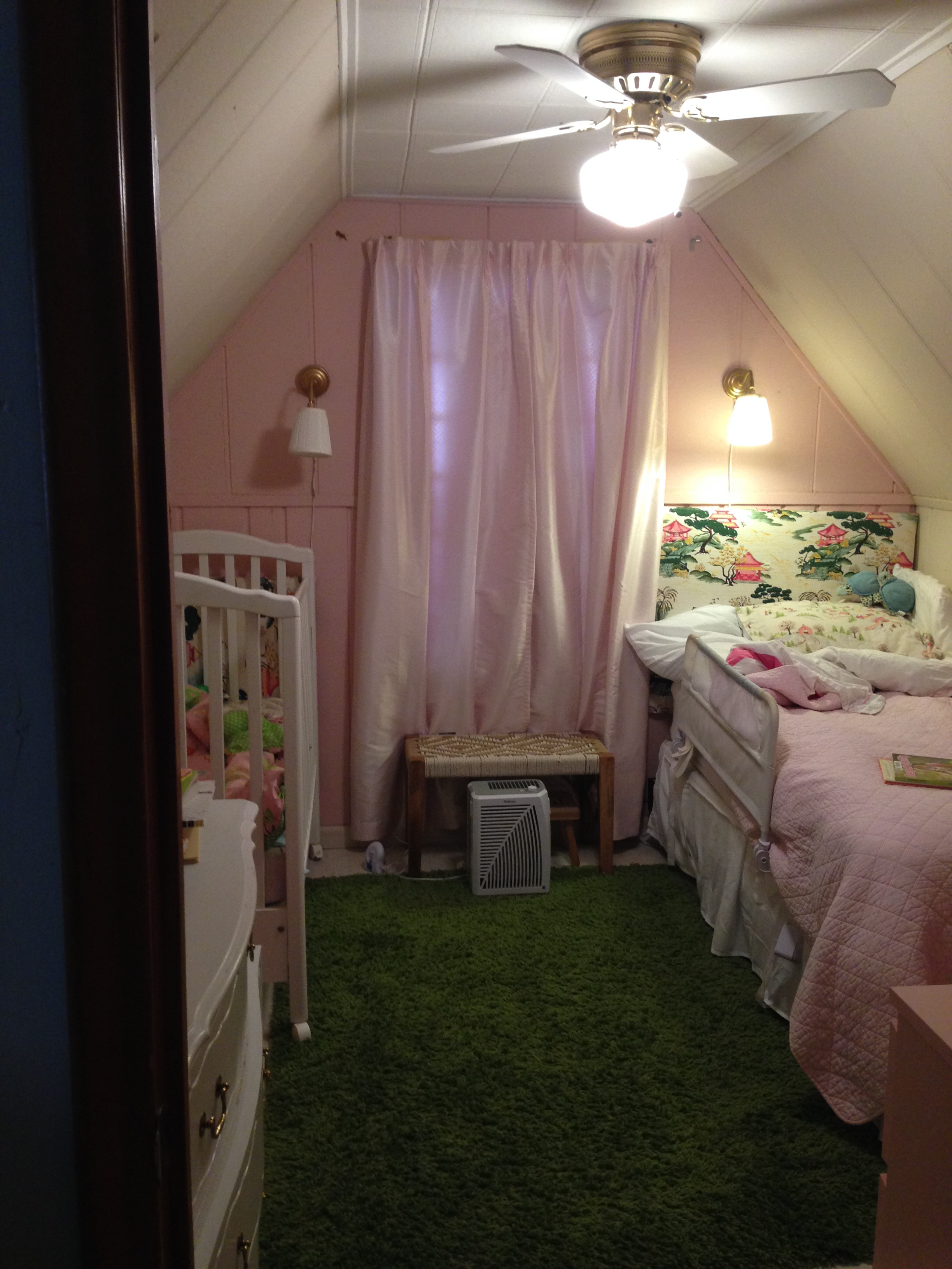 You’ve seen the inspiration pictures. The virtual vision board in all its beauty. Now, lets turn our attention the actual room in flux. The photos above are admittedly not the greatest. OK, they are terrible but you get the idea.  Though the footprint is a decent size, approximately 9′ x 11′, there are slanted ceilings,  paneled walls and an abnormally large radiator which have each created significant design challenges. You’ll note in the pictures that there is a crib and a twin bed. We now have both girls in twin beds, and have for a while. There is not enough head room to accommodate bunk beds but truthfully I prefer the symmetry of a bed on either side of the window. I’ve grown tired of the vintage fabric that I used for the head-boards, the green shaggy carpet that gave the room some texture and the pink accent wall, much as I love pink. Even the geometric patterned roman shade (see below) that I had custom-made five years ago seems dated. It all feels too prissy and preppy.  I’m going for a modern, bright and whimsical bedroom as inspired by the plethora of  images I have put before you. Pinterest, you are a blessing and a curse.