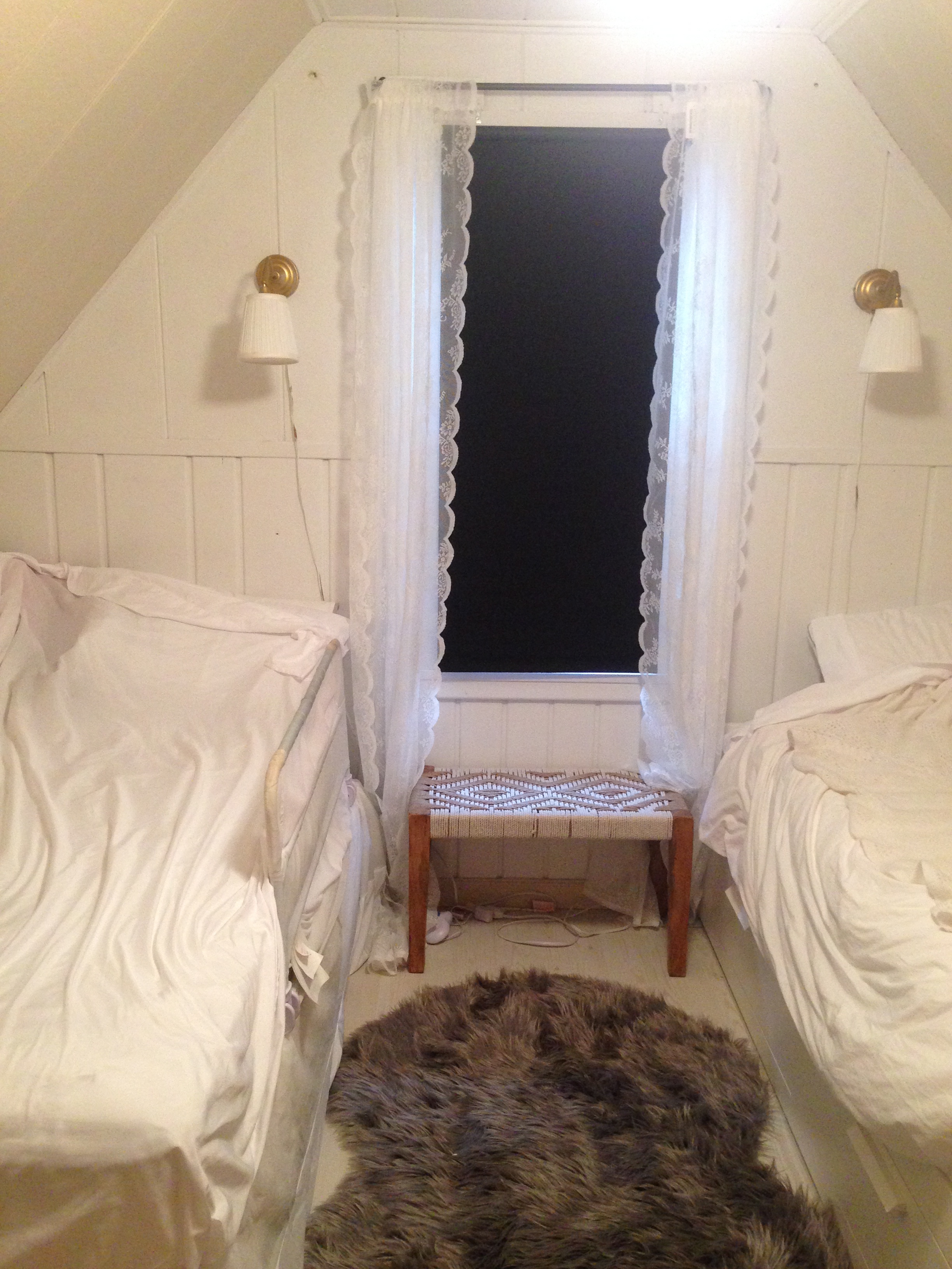 Much as I love before and after pictures we at not at the after stage yet. Below are some middle pictures. The work in progress. Old finishes have been removed The pink wall is now painted white (Glidden white on white from Home Depot) and I lay down a temporary fuzzy rug and made the beds with plain white sheets from Target. The blank canvas is ready!