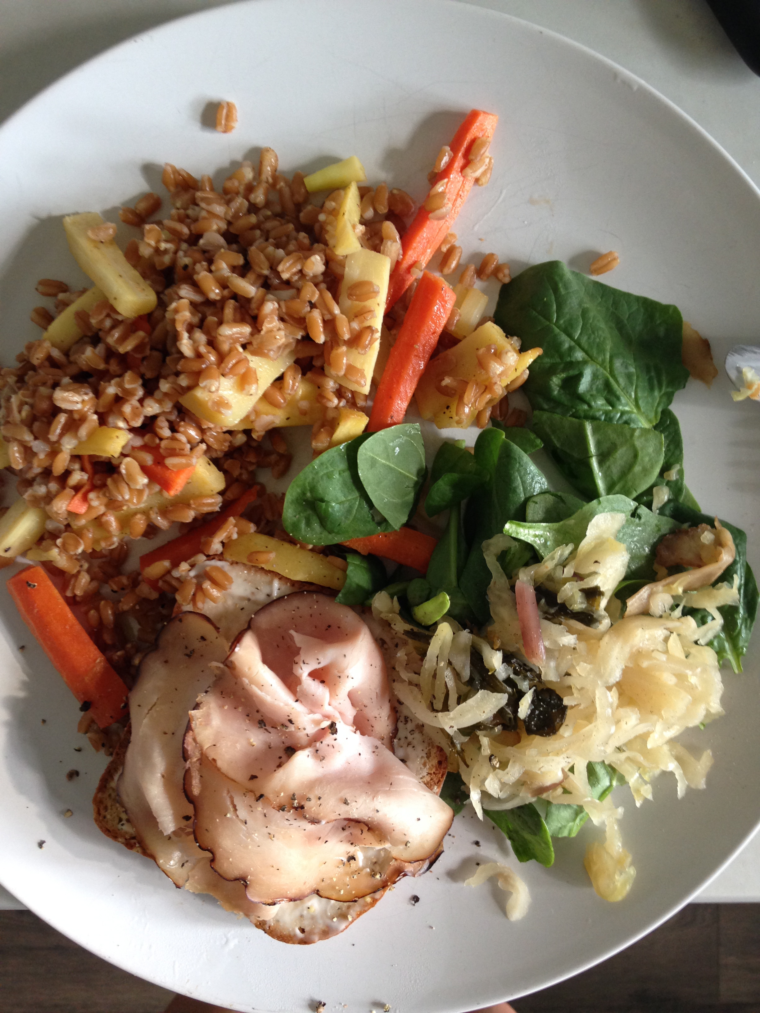 - Smitten Kitchen for zucchini ribbons with almond pesto salad (not pictured), farro with parsnips and carrots (minus the feta).