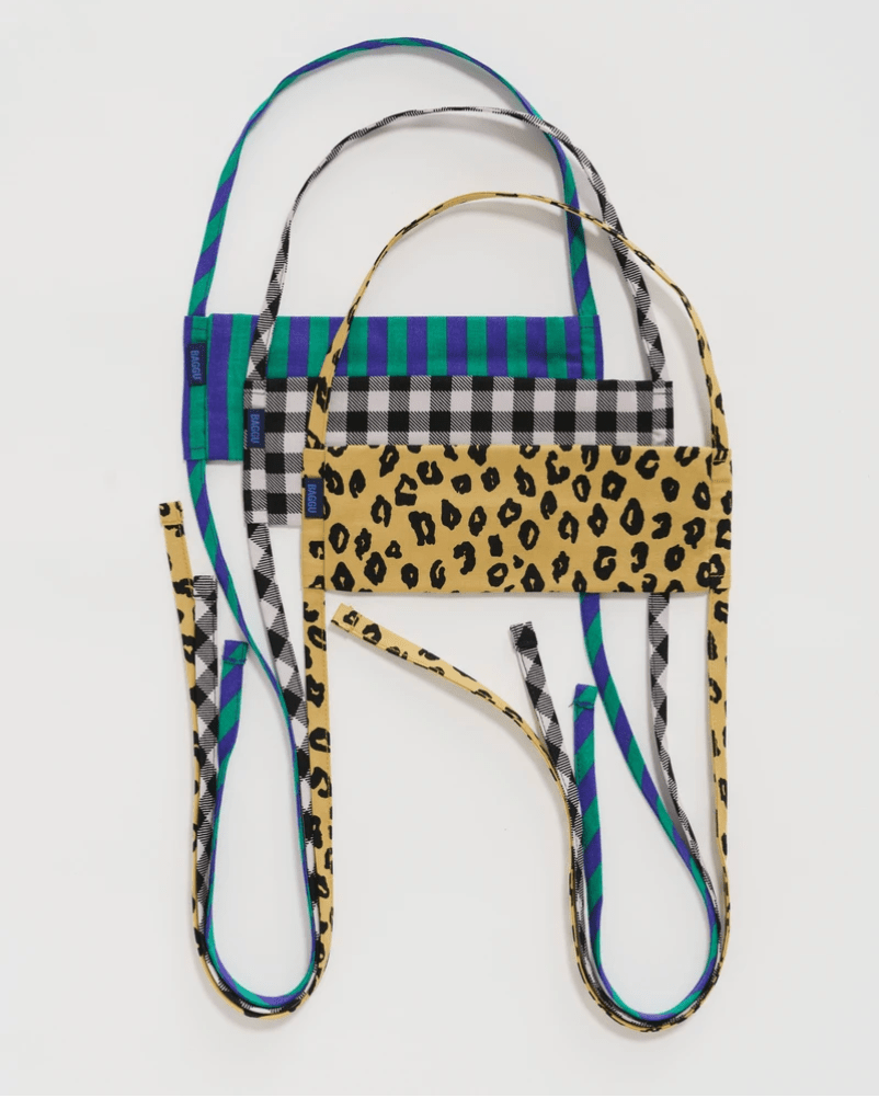 Do you prefer graphics to floral? How about these lovelies ^^ from Baggu? Not only do they have several prints and a nice array of solid masks to choose from they also offer both ties back and ear loop styles. Set of three costs $32 buckaroos with free shipping. I love the leopard print!