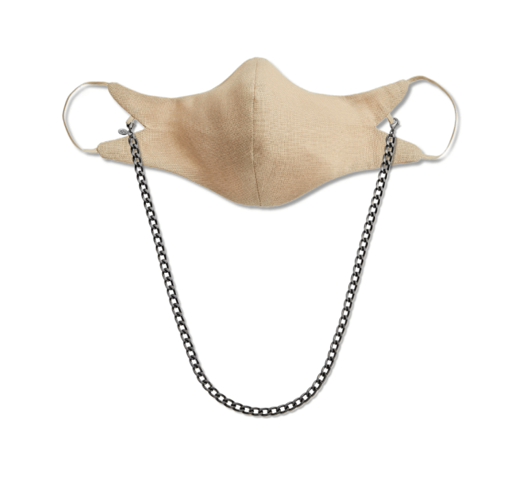 If you want an all in one mask, how about this sleek and sophisticated mask by Second Wind? Made with durable and breathable cotton linen detailed with a substantial and stylish chain this it a nice choice. I love the lines of this mask. It looks well-crafted and feels special but it totally neutral and wearable.