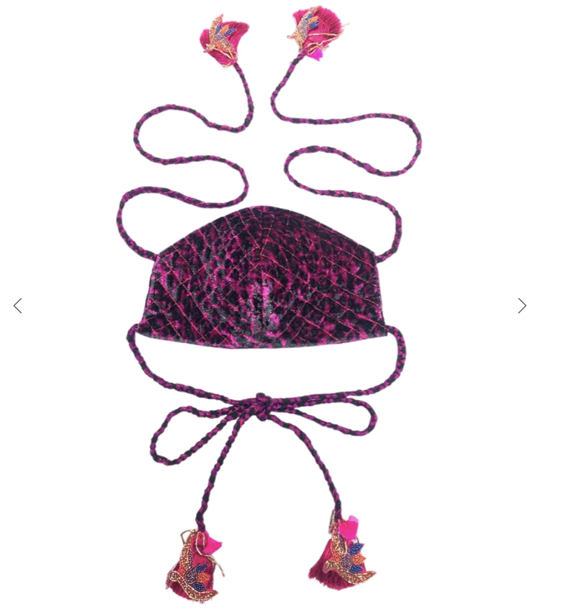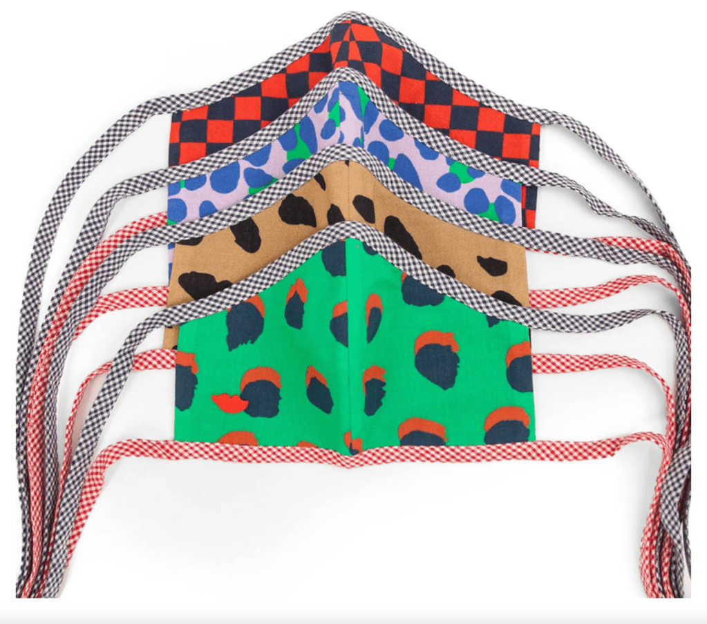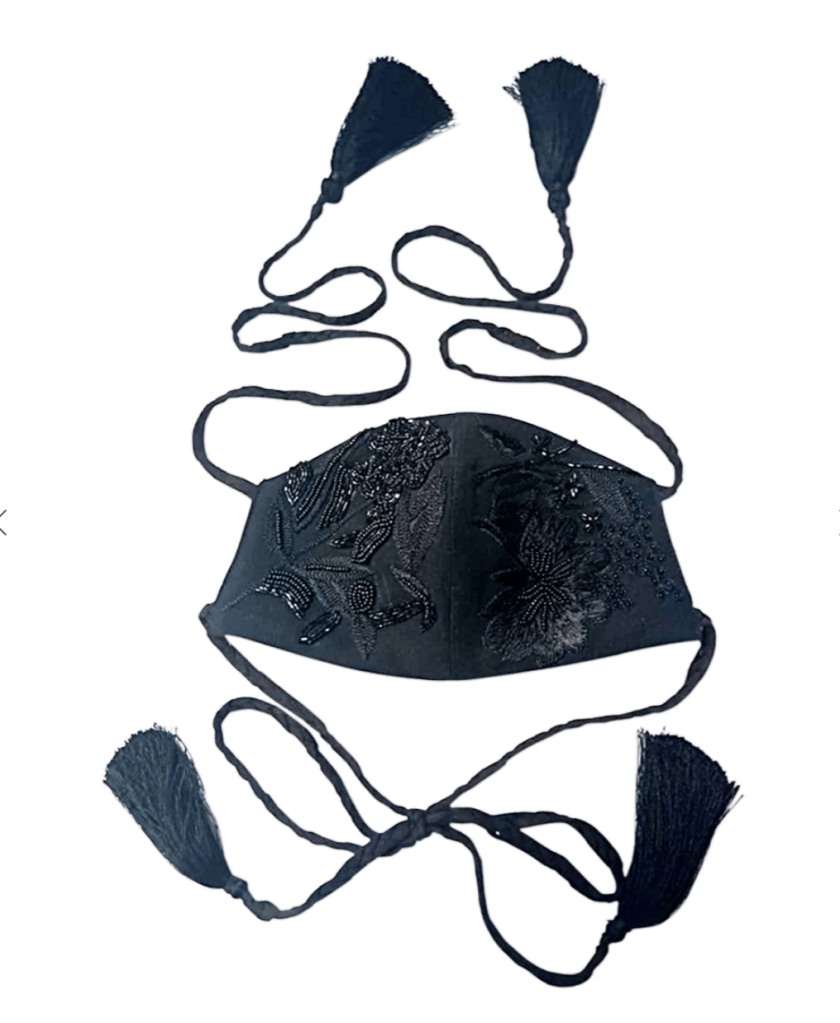 Let’s begin with this daring and colorful cotton velvet mask from Roopa Pemmaraju. Their masks typically have intricate handmade details and sell for $80 and up. Lucky for you, Anthropologie has commissioned a gorgeous private collection of their masks that sell for just $20 a pop. Look at that braided tie detail! Good for an aunt, nanny or teacher perhaps?