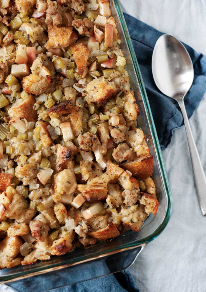 The stuffing I’ve made for the past several years is alway a crowd pleaser. I would love to try something different like a mushroom and leek stuffing but I’ll save that for next year. I’m going to stick with my sausage, apple and sage stuffing because not only is it delicious the day of, but warm it up and throw a fried egg on top and you’ve got yourself a nice day-after Thanksgiving breakfast. I cut up day-old bread in lieu of pre-packaged cubes. I’ve made this recipe with a variety of breads, including gluten-free, and it always turns out great. Below is my thrown together recipe but you can find something similar at Simply Recipes