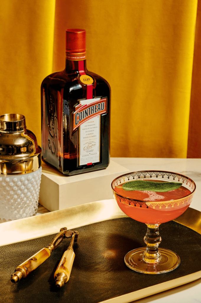 Add all ingredients except sparkling wine into shaker. Add ice and shake. Fine strain into coupe glass. Finish with sparkling wine and garnish with sage leaf and orange wheel, if desired.