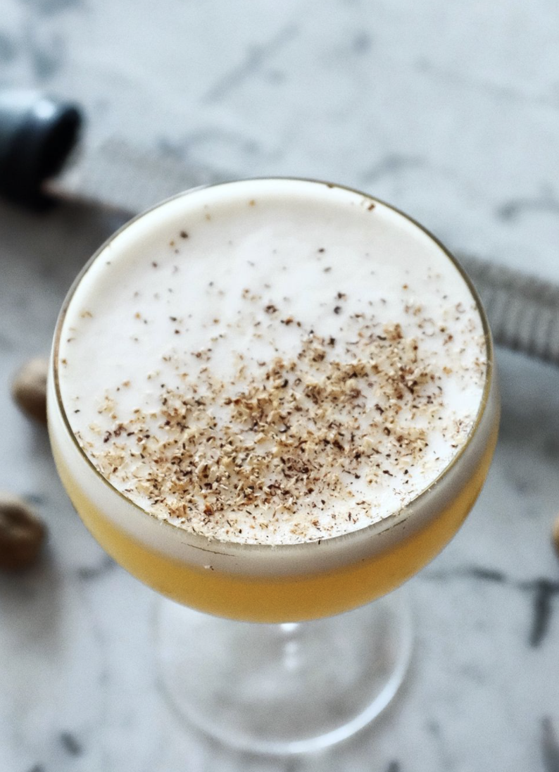 Combine apple brandy, fresh lemon juice, egg whites, honey and apple cider in a shaker tin. Shake vigorously for 20 seconds to froth the egg whites. Add ice and shake vigorously for another 20 seconds. Double-strain into a coupe glass. Make sure you have at least a quarter inch of froth on top. Microplane fresh nutmeg on half of foam.
