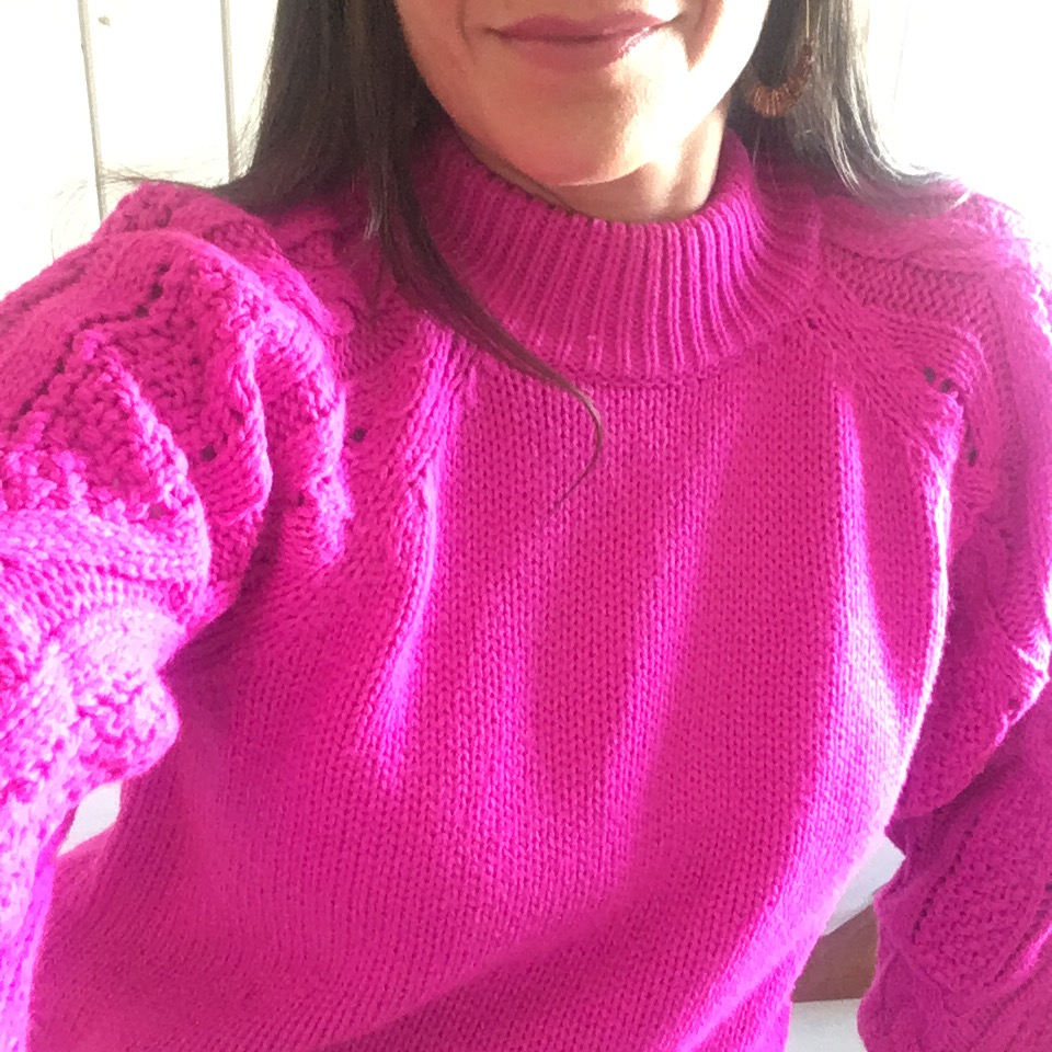 I’m totally into this gorgeous hot pink sweater from Who What Wear which is not for the faint-hearted. The cable knit sleeves and bright color make this pullover striking. You’ll definitely stand out in a crowd. Here I come!