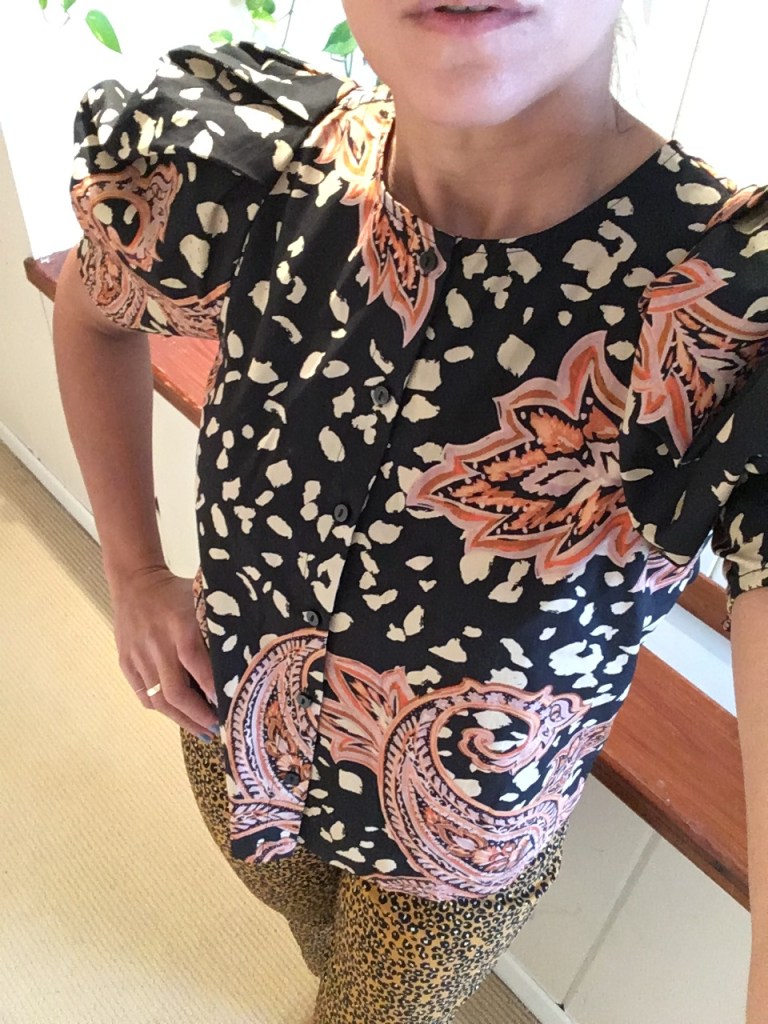 I love the print of this blouse but I definitely have to be in the mood for the mega sleeves. This is a confusing trend for me. I love bold sleeves in theory but I am not convinced I can pull them off. The leopard spot pants and printed blouse are both from the Who What Wear collection. The top would be cute with a pair of old Levis or a black skirt as well.