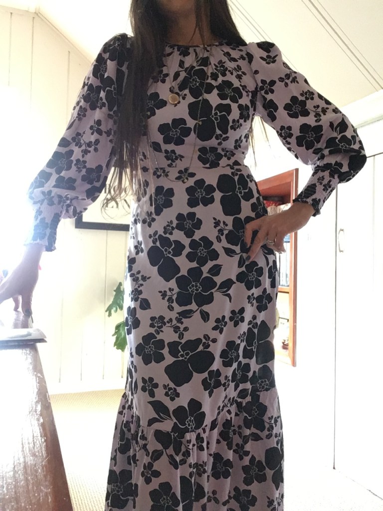 Look it’s not a top! I was drawn to this printed dress because of the lilac backdrop. I love the print, the sleeve shape and the hemline. I was surprised by how much I liked the fit of the dress. It is a flowing maxi dress but still has structure. Be warned, there is no stretch. This would be great to wear a wedding, party, church, dinner date, gallery opening, brunch, the list goes on. I would wear it with tall boots, pumps or sandals in the spring. It may sound crazy but I would also wear it with sneakers or my checkered vans slides cause I’m funky like that.