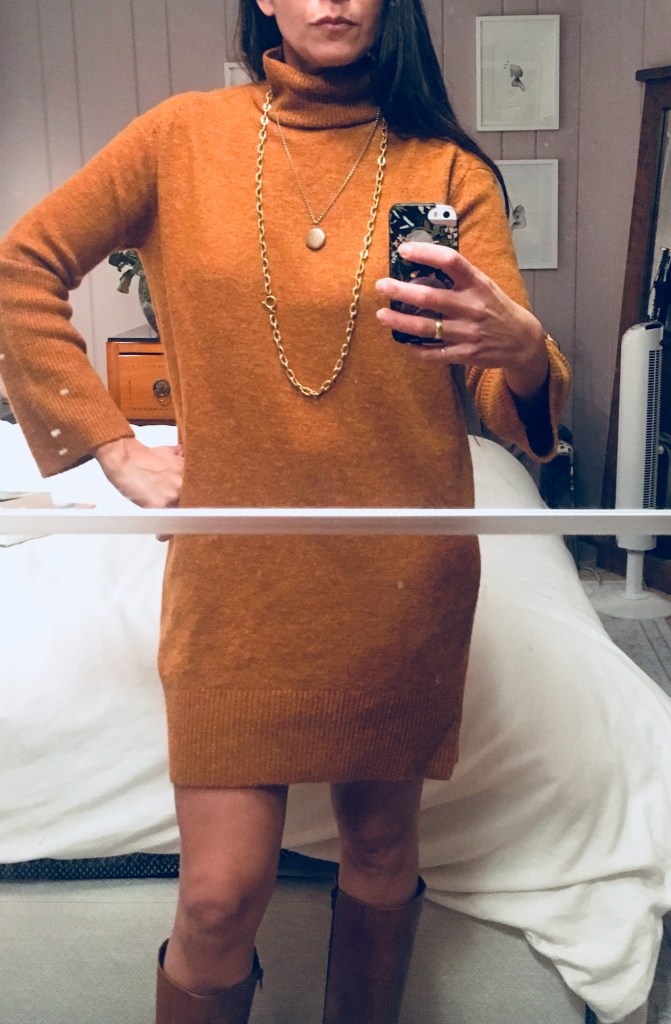 I’ll preface my comments here by telling you that I am not a sweater dress kind of gal but the color of this one caught my eye. I threw it on with a couple of necklaces and my tall cognac boots but in reality I might style this a little differently. The dress is super cozy and I like that it’s not body hugging. I might wear this over leggings with a pair of leg-warmers and clogs or with the boot pictured without bare legs. Maybe a thick pair of tights or faux leather legging? To make the look more pulled together I would throw on a belt but it still looks cute unbelted.