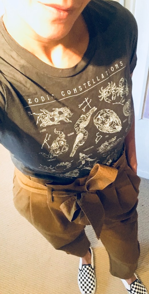 I admired these high-waisted paper bag pants for weeks because I love the rich olive color but I was convinced that because of the length, they would look bad on me. You can judge for yourself, but I actually kind of like them with my zodiac graphic T (from Target of course) and my Vans. You can totally wear these with ankle boots and a cropped sweater for a more tailored and high fashion look but I’m feeling the skater girl vibe some days and these fit right in with that. You could also pair these with sandals and a flowing top tucked in for spring. Basically these are all-season pants.