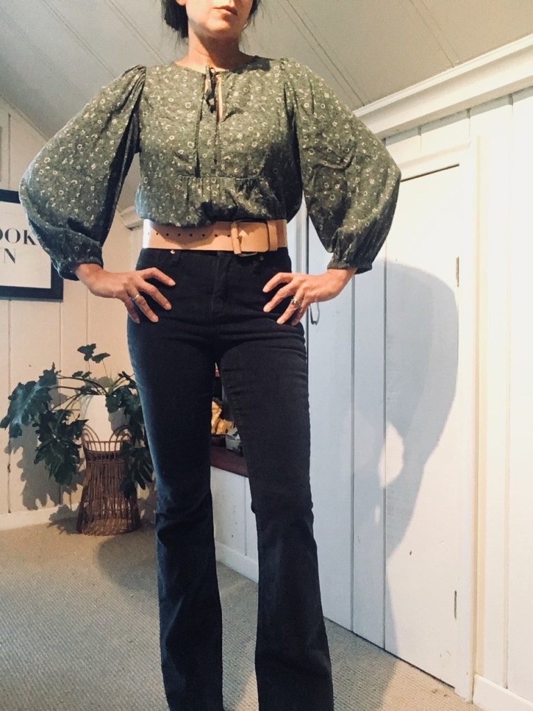 OK, let me tell you how excited I was to find these cords. They are a gorgeous deep green color (can you tell?) AND they are cut long so they actually worked for me. I tend to have issues with regular inseams being too short for me and ‘long’ being too long. These are basically perfect. I love the high rise, the flare leg, the color, everything about these pants. There were a total score. Also a clearance rack find since they were an online only item returned in-store. I like how the printed flowing top looks with them. Both pieces are from A New Day. Belt is mine from years ago but any wide belt would do. These cords would also look great with a big cozy sweater.