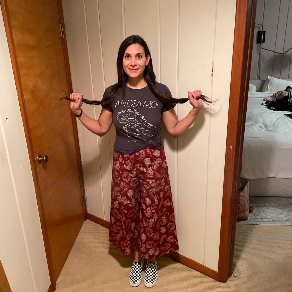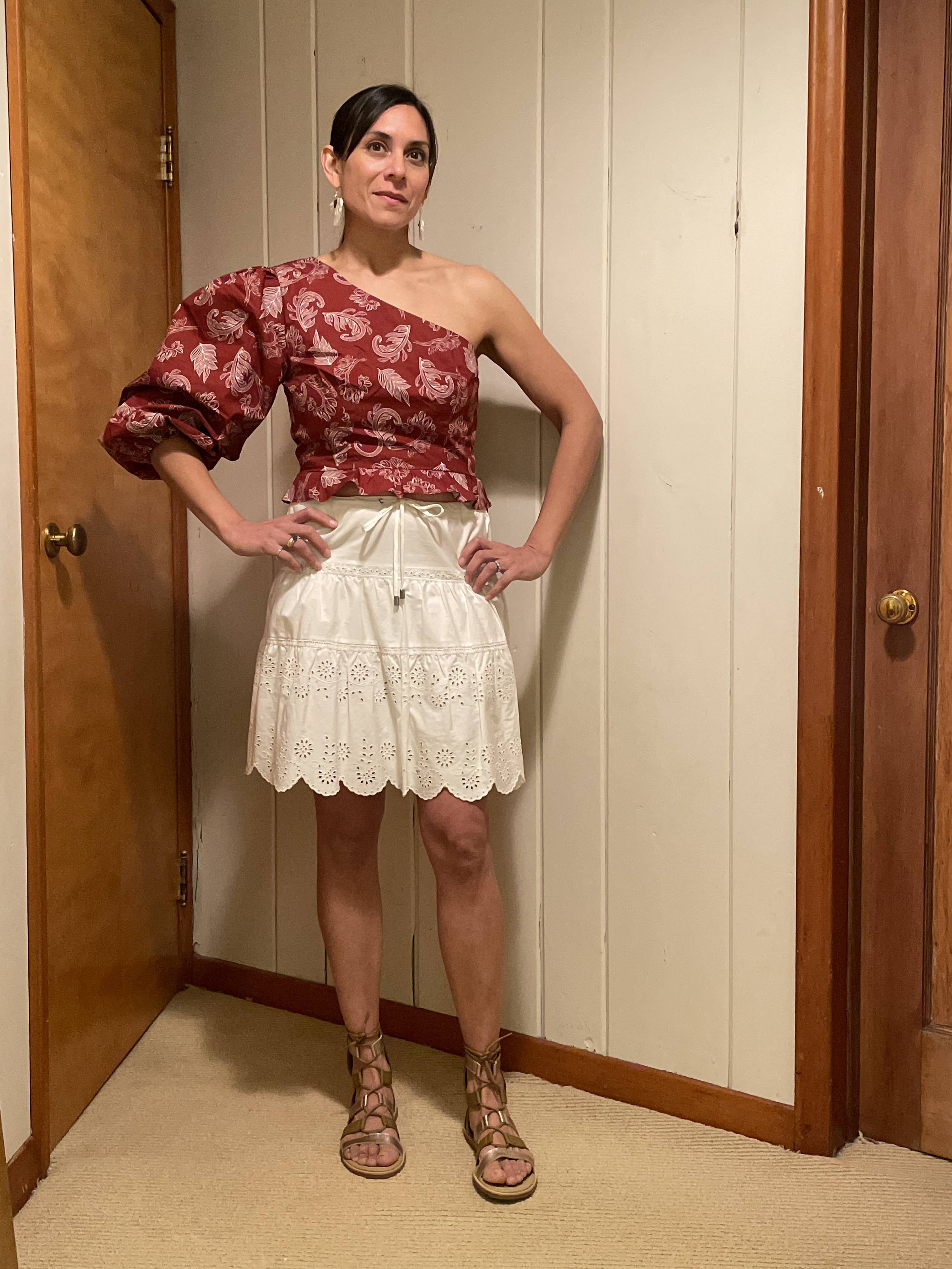 The Anthro top with a white skirt from Burberry that I bought about 20 years ago when I worked there. I still love it and wear it a lot. The gladiator sandals – which I know are somewhat passé – are Sorel. I still like the look of gladiator sandals and they are comfortable and good for walking which I do a lot of. I made the earrings!