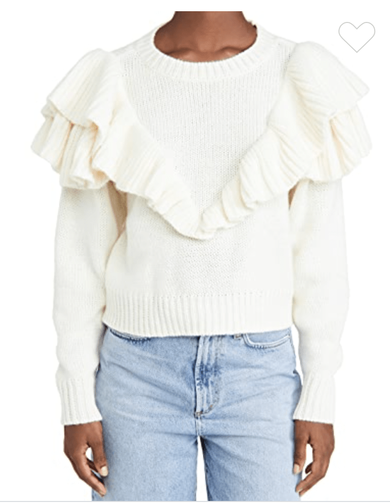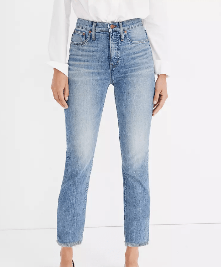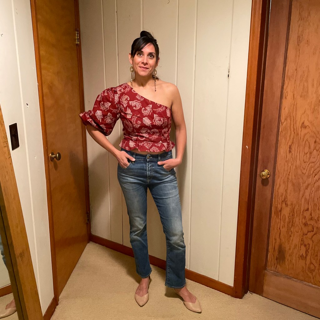 Jeans, Nude flats and dangling earrings. My jeans are R13 but they don’t seem to have this style anymore. I found similar styles below. You really need to try jeans on to get the best fit for your shape. Rreally whatever style jean you like could work with this top. A denim skirt would be cute too!