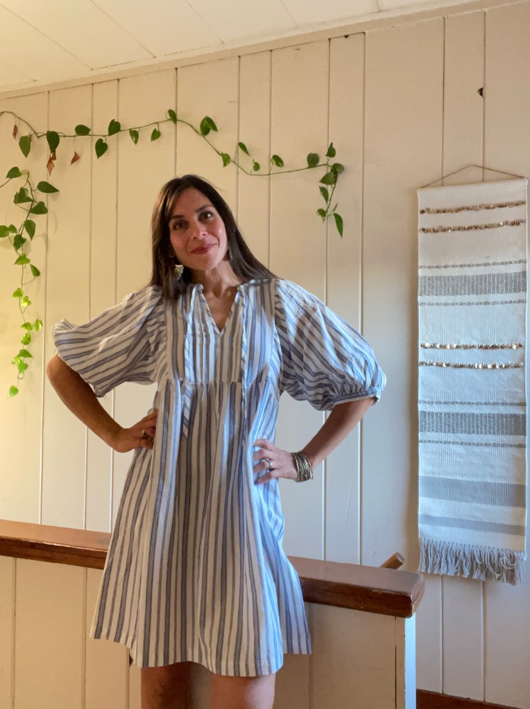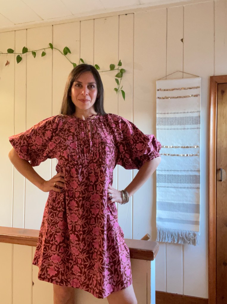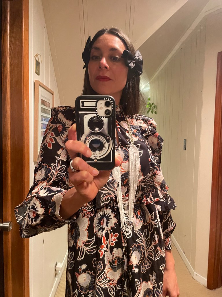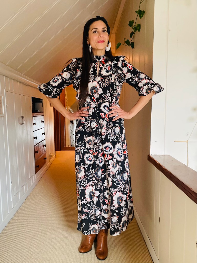 This dress was a pleasant surprise! I thought maybe it was going to be too much for me because of the print and the length but it’s a keeper. You may have seen my reel where I styled it for both fall and spring. If you missed it, this dress is cute with a jacket and boots or sandals. It has an adjustable tie waist and ruffles on the sleeves. I rolled them up part way for the second look. In the first shot, I wore a long white strand of beads and little bow (peep) satin hair clips à la Simone Rocha. The clips are a two pack from Wild Fable.