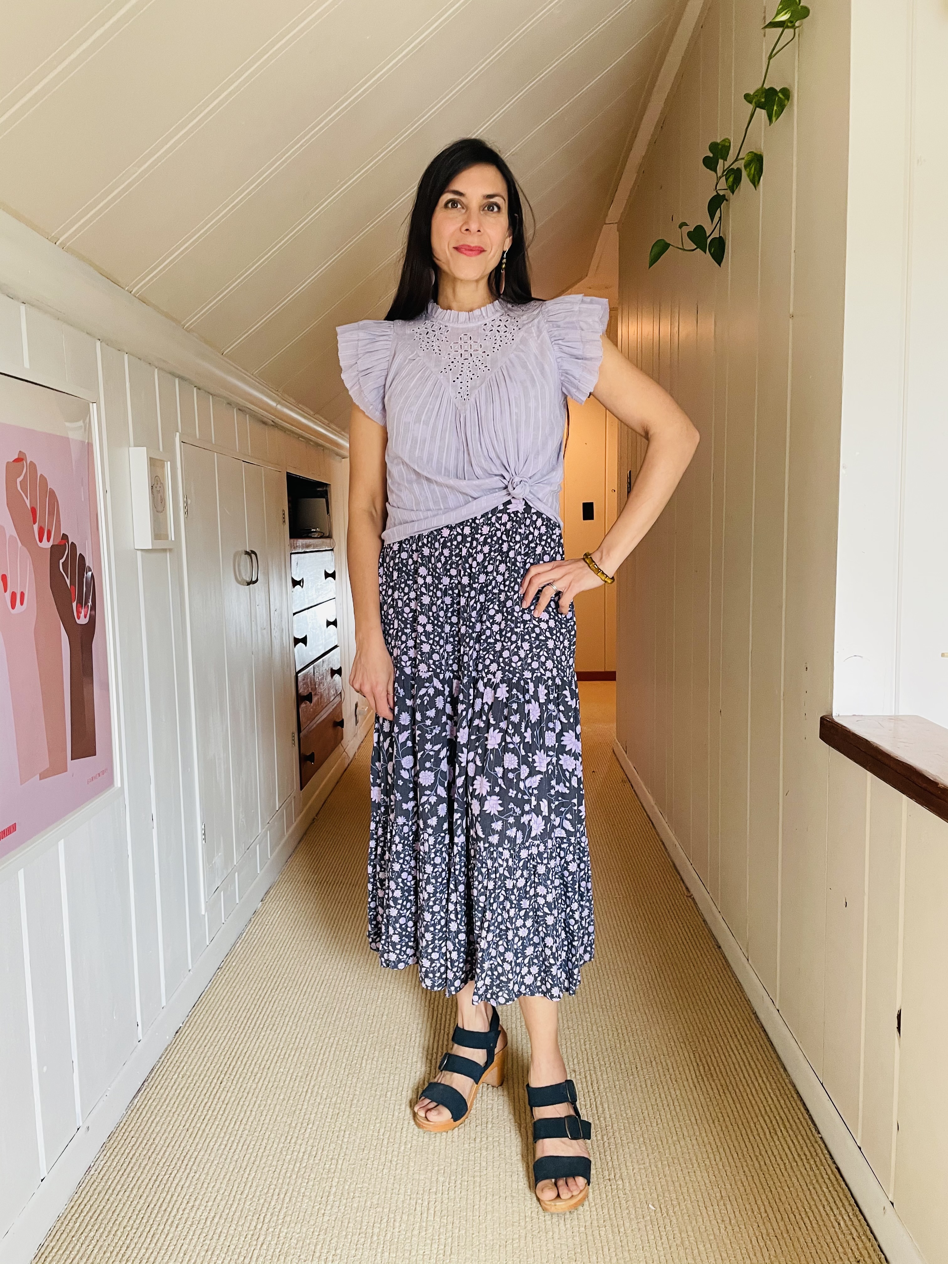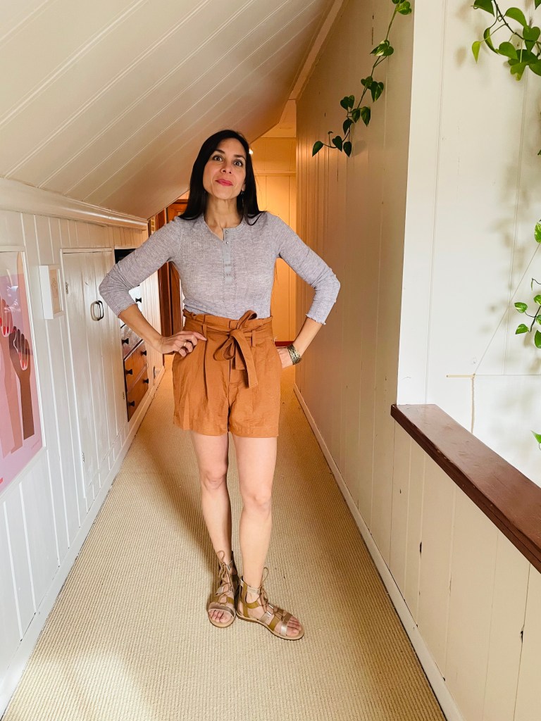 I paired this Wild Fable pointelle henley with A New Day tie waist shorts. I really like this color combo! The terra cotta and muted lilac work well together. I’m wearing my Sorel gladiator sandals because I like a nice sturdy stylish sandal (SSS) for my long city walks.