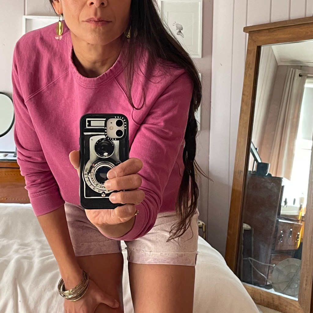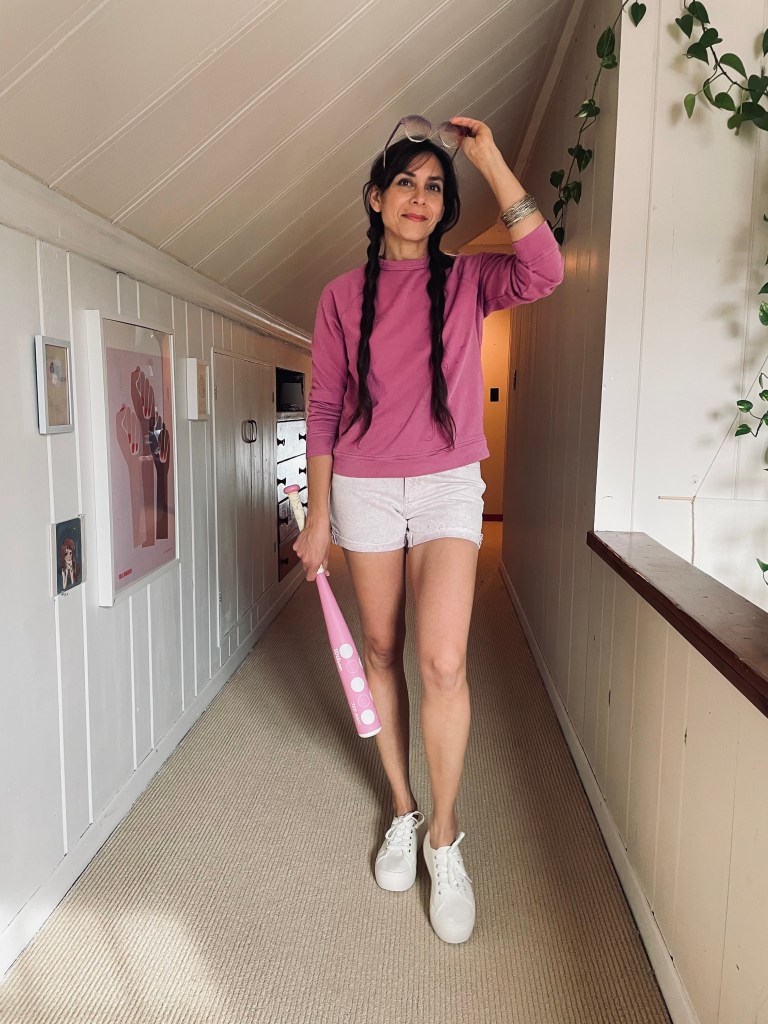 I’m totally into the pink and purple together. The sweatshirt is great to throw on for a little pop of color with just about anything. The purple acid wash shorts are clearly a trend item but they could work with a few things. Think flowing printed blouse or graphic t-shirt. I added a pair of gold earrings and a stack of bracelets just for fun.