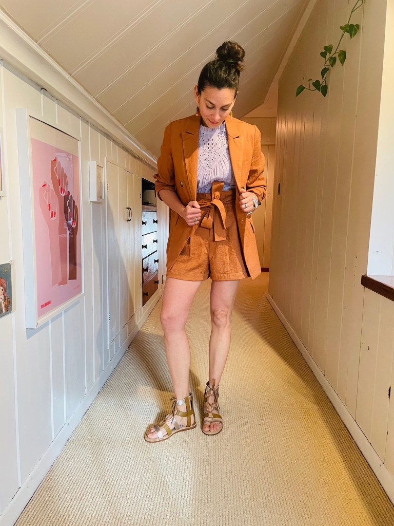 A short suit! What the wha?? The jacket and shorts are NOT merchandised together but they just happen to be made from the same fabric so I thought, Why not? This little outfit could work for a casual work environment or crisp summer evening. You might recognize that flutter sleeve blouse…