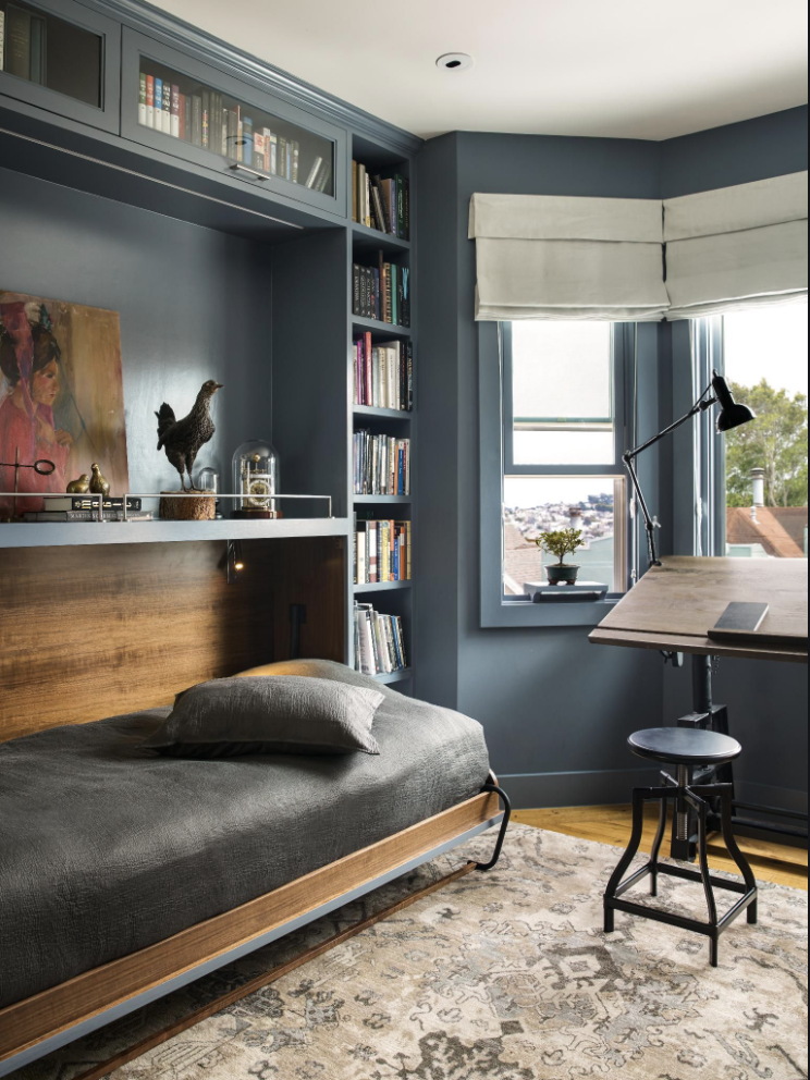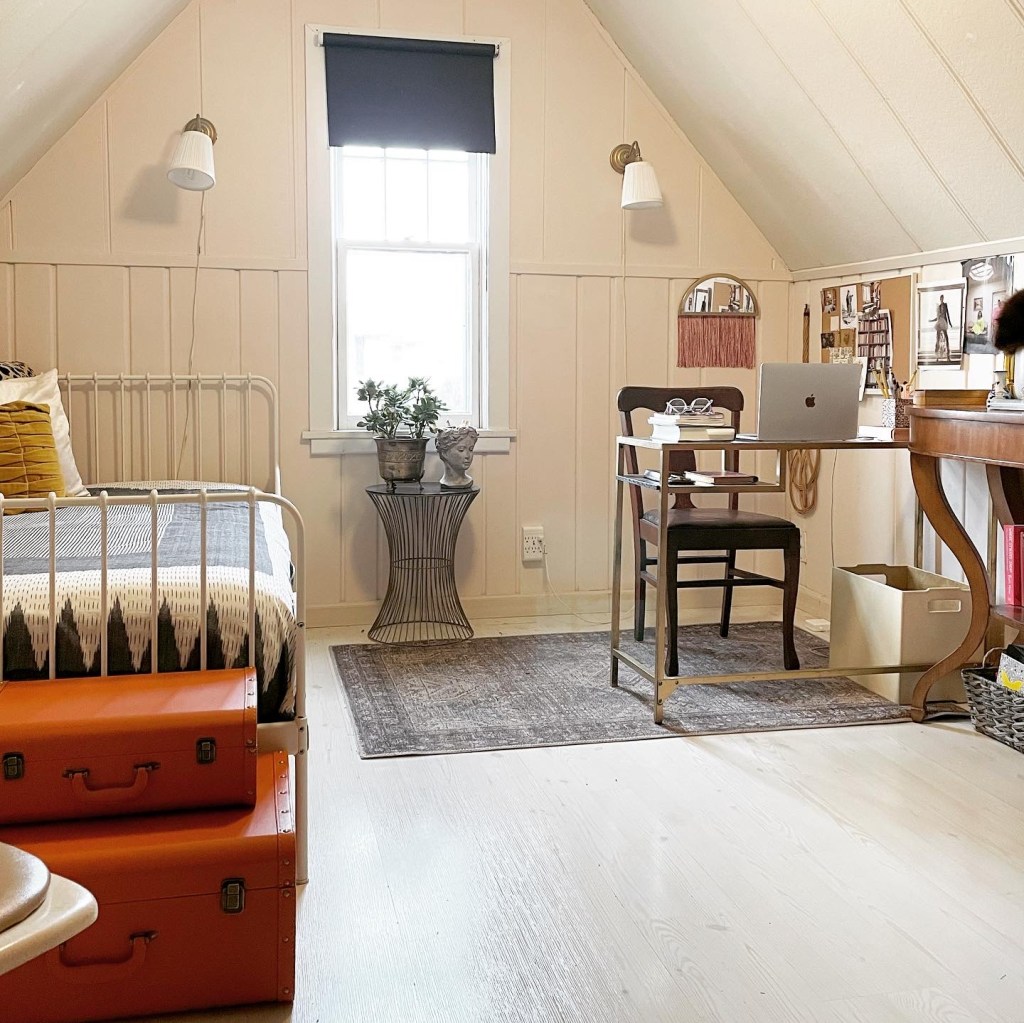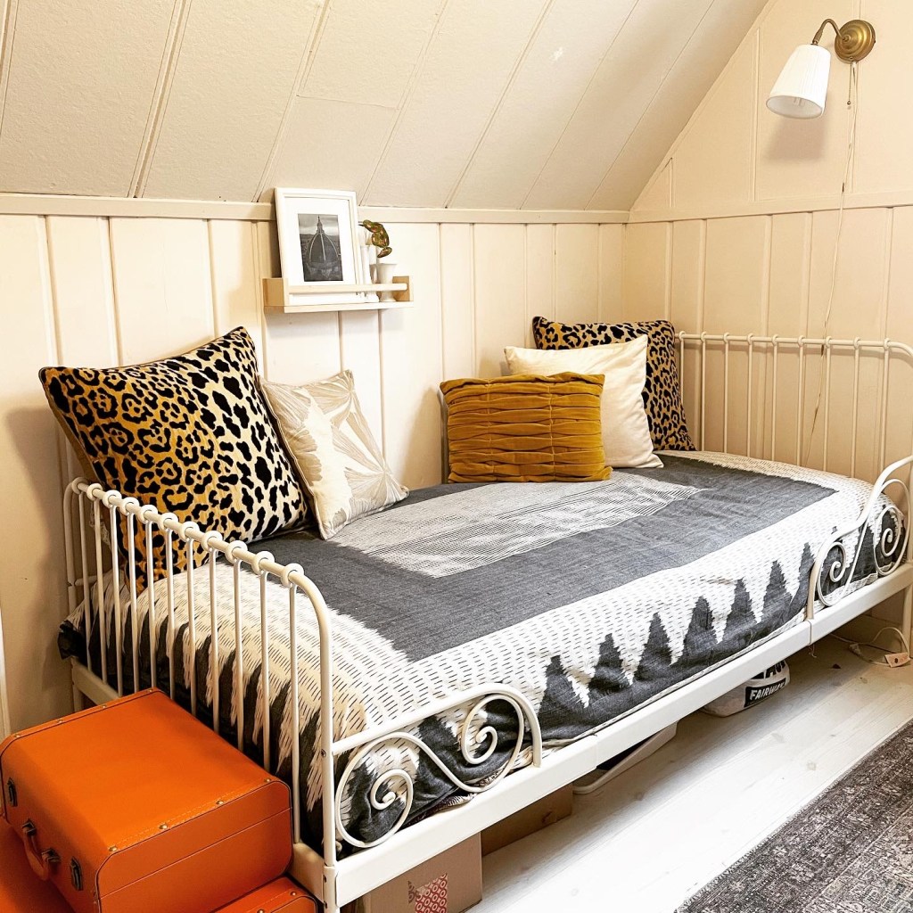 I kept one of the girl’s beds intact and restyled it to be a day bed where I can read or work if I’m feeling lounge-y. Also, if we have a solo visitor or an adult takes ill, we have a bed to sleep in. Similar beds below, which both have added trundle. Click images to shop.
