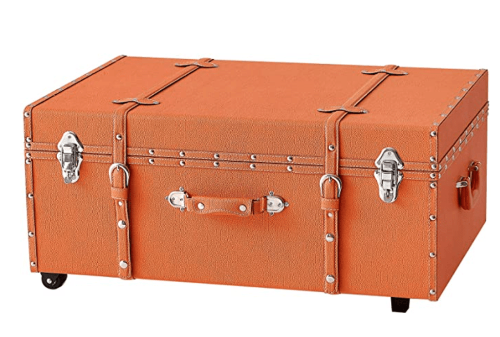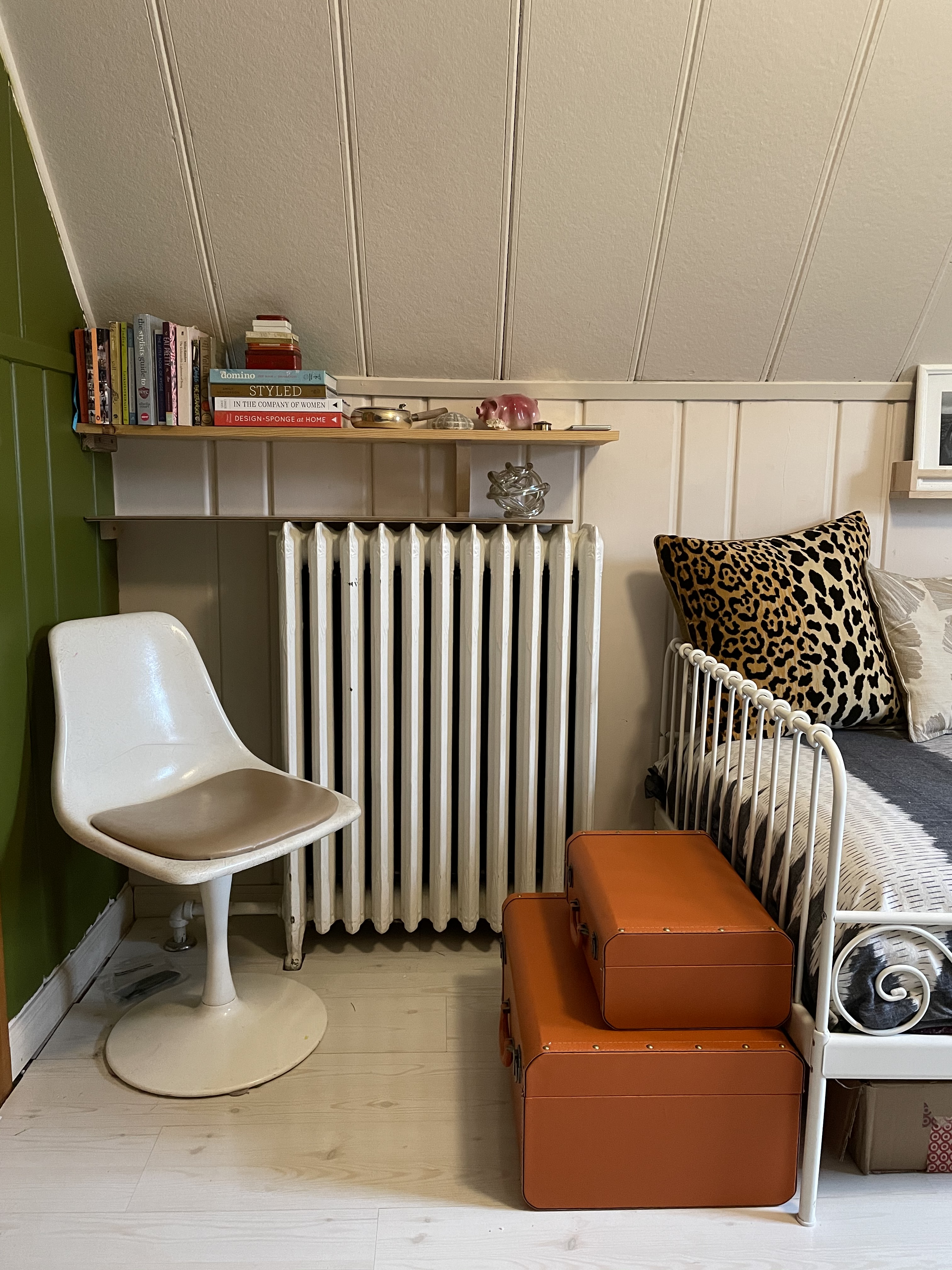 The orange suitcases were a total score from Homegoods. Nothing like a good Homegoods find! They are quite heavy and impractical for actual travel but they add a nice pop of color to the room and I use them for storage. They also happen to be the perfect height to act as a foot rest for my vintage tulip chair, you know, in case I need to prop my tootsies up. Here are a couple of options if you like the orange as much as I do.
